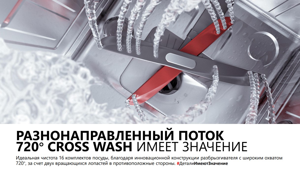 - 720° Cross Wash. Система двойного противовращения разбрызгивателей создает перекрестные потоки воды под разными углами. Это исключает появление «слепых зон» в камере: вода эффективно проникает в углубления чаш и между плотно установленными тарелками, удаляя даже самые стойкие загрязнения.