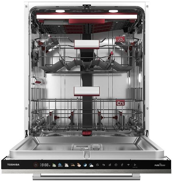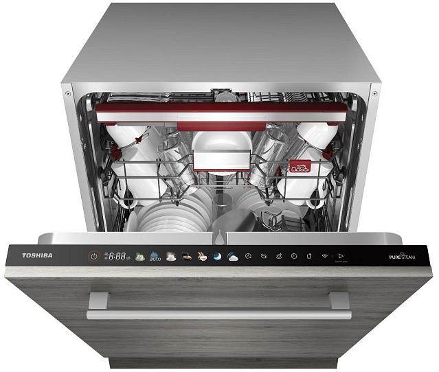 Встраиваемая модель Тошиба отлично впишется в любой интерьер, главное — правильно выбрать место, чтобы подвести коммуникации. Устанавливается в нишу целиком, полностью закрывается декоративной панелью. Обратите внимание: в комплекте не идет фасад, его необходимо установить самостоятельно. Имеет стандартные размеры, поэтому может не поместиться на очень маленькой кухне. В камеру можно загрузить ограниченное число комплектов: 16 шт. Комплектом считается набор посуды на одного человека, который нужен для полноценного приема пищи: глубокая и плоская тарелки, тарелка для салата, блюдце под чашку, сама чашка, ложка и вилка.