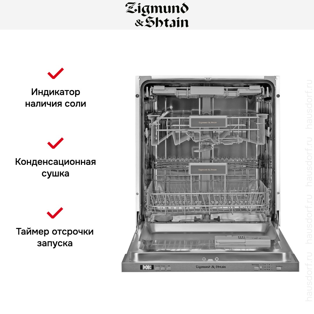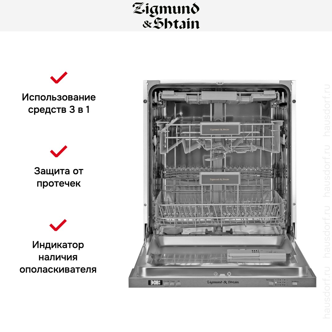 Встраиваемая модель Зигмунд Штайн отлично впишется в любой интерьер, главное — правильно выбрать место, чтобы подвести коммуникации. Устанавливается в нишу целиком, полностью закрывается декоративной панелью. Обратите внимание: в комплекте не идет фасад, его необходимо установить самостоятельно. Имеет стандартные размеры, поэтому может не поместиться на очень маленькой кухне. В камеру можно загрузить ограниченное число комплектов: 15 шт. Комплектом считается набор посуды на одного человека, который нужен для полноценного приема пищи: глубокая и плоская тарелки, тарелка для салата, блюдце под чашку, сама чашка, ложка и вилка.