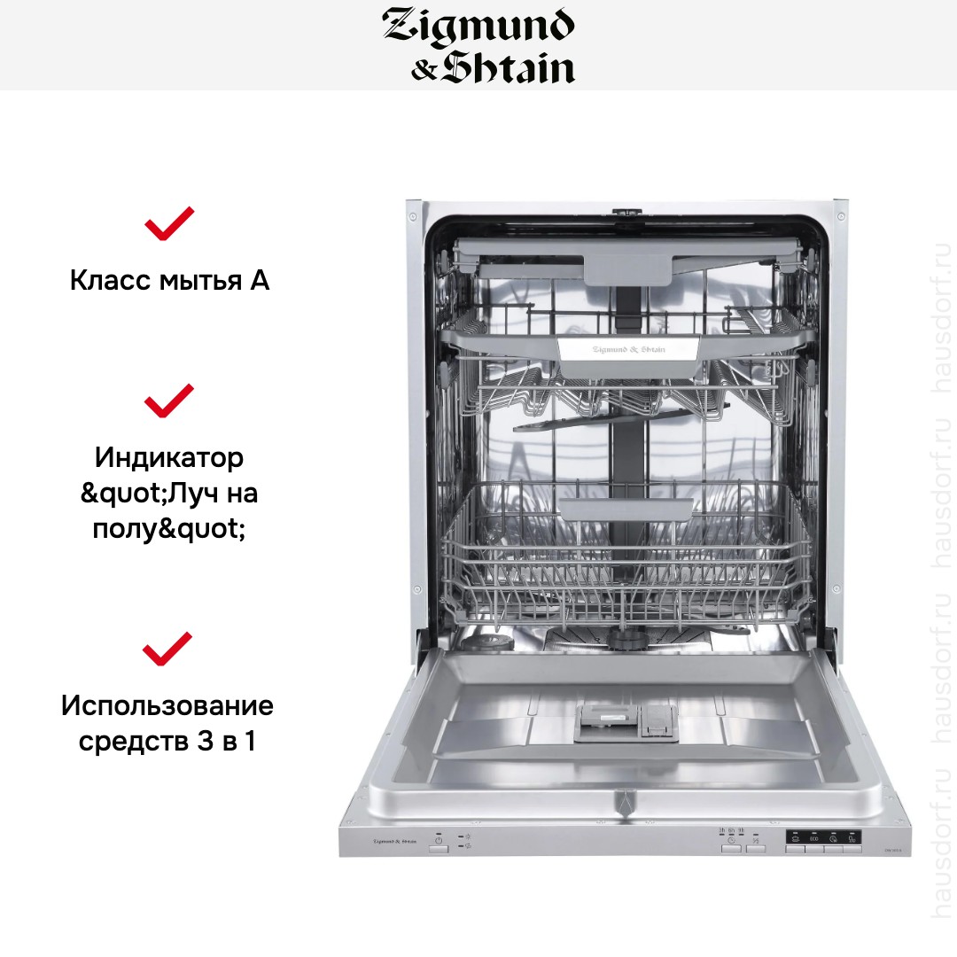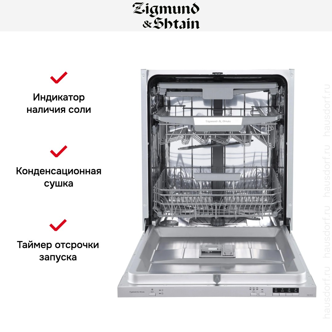 Встраиваемая модель Зигмунд Штайн отлично впишется в любой интерьер, главное — правильно выбрать место, чтобы подвести коммуникации. Устанавливается в нишу целиком, полностью закрывается декоративной панелью. Обратите внимание: в комплекте не идет фасад, его необходимо установить самостоятельно. Имеет стандартные размеры, поэтому может не поместиться на очень маленькой кухне. В камеру можно загрузить ограниченное число комплектов: 14 шт. Комплектом считается набор посуды на одного человека, который нужен для полноценного приема пищи: глубокая и плоская тарелки, тарелка для салата, блюдце под чашку, сама чашка, ложка и вилка.