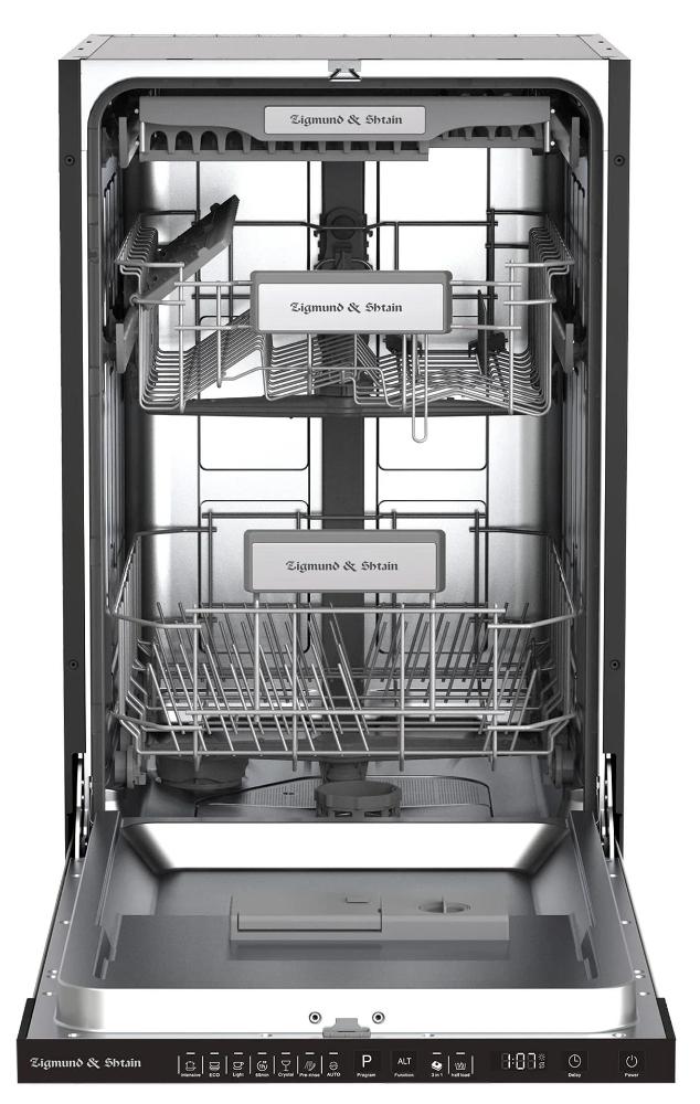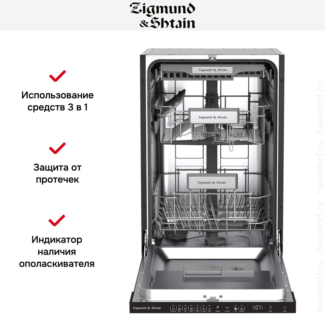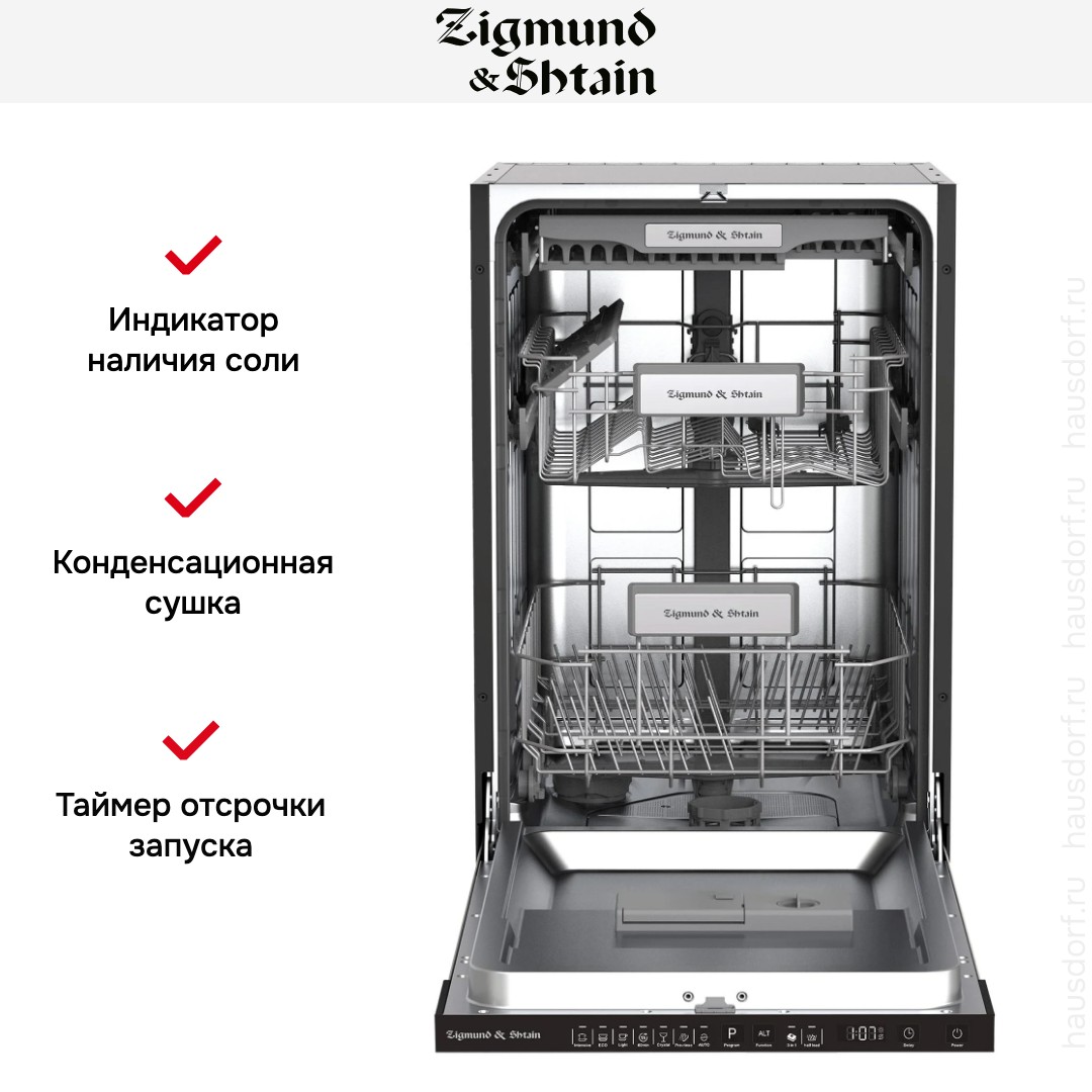 Встраиваемая модель Зигмунд Штайн отлично впишется в любой интерьер, главное — правильно выбрать место, чтобы подвести коммуникации. Устанавливается в нишу целиком, полностью закрывается декоративной панелью. Обратите внимание: в комплекте не идет фасад, его необходимо установить самостоятельно. Имеет уменьшенную ширину — благодаря этому поместится даже на очень маленькой кухне. В камеру можно загрузить ограниченное число комплектов: 11 шт. Комплектом считается набор посуды на одного человека, который нужен для полноценного приема пищи: глубокая и плоская тарелки, тарелка для салата, блюдце под чашку, сама чашка, ложка и вилка.