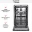 Дизайн рассчитан на минимализм и практичность, поэтому внешний фасад может быть оформлен под ваш шкаф. Узкая конструкция не жертвует вместимостью: машина принимает до 11 комплектов. Это оптимальный вариант для семьи из 2-4 человек или для небольшой студийной кухни. Корзина для столовых приборов упрощает размещение ножей и ложек, а использование таблеток 3 в 1 делает уход ещё проще, совмещая мойку, ополаскивание и защиту от накипи.