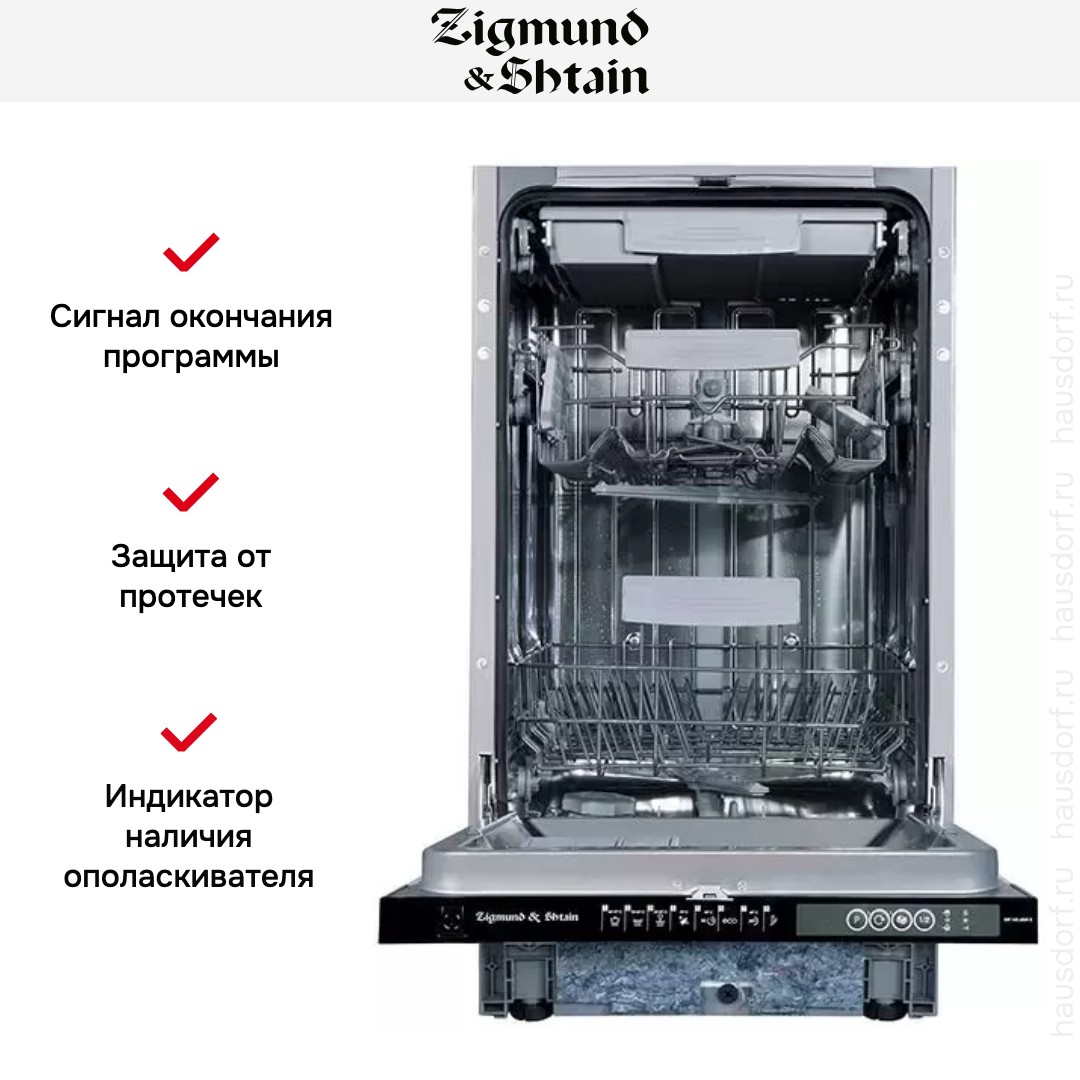 Встраиваемая модель Зигмунд Штайн отлично впишется в любой интерьер, главное — правильно выбрать место, чтобы подвести коммуникации. Устанавливается в нишу целиком, полностью закрывается декоративной панелью. Обратите внимание: в комплекте не идет фасад, его необходимо установить самостоятельно. Имеет уменьшенную ширину — благодаря этому поместится даже на очень маленькой кухне. В камеру можно загрузить ограниченное число комплектов: 10 шт. Комплектом считается набор посуды на одного человека, который нужен для полноценного приема пищи: глубокая и плоская тарелки, тарелка для салата, блюдце под чашку, сама чашка, ложка и вилка.