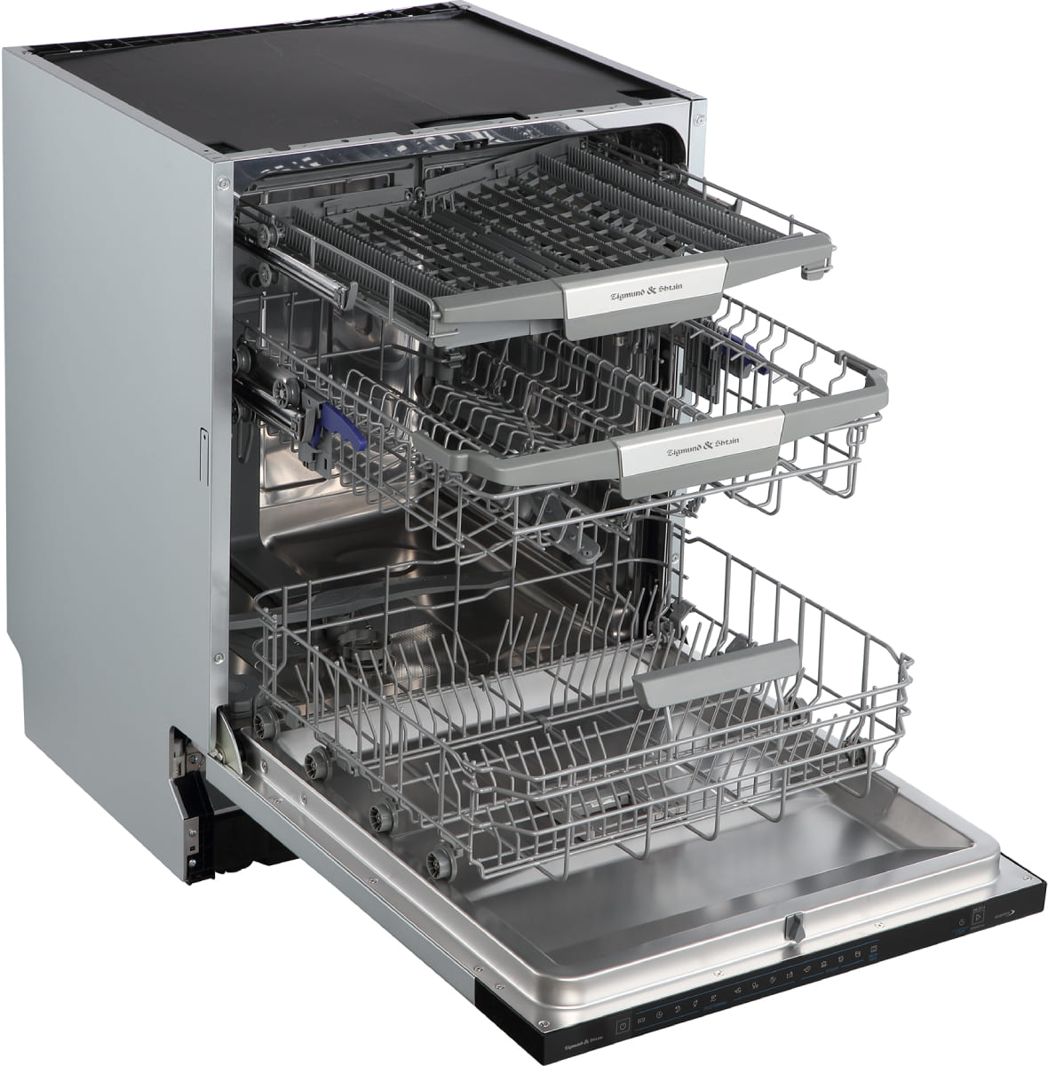 Встраиваемая модель Зигмунд Штайн отлично впишется в любой интерьер, главное — правильно выбрать место, чтобы подвести коммуникации. Устанавливается в нишу целиком, полностью закрывается декоративной панелью. Обратите внимание: в комплекте не идет фасад, его необходимо установить самостоятельно. Имеет стандартные размеры, поэтому может не поместиться на очень маленькой кухне. В камеру можно загрузить ограниченное число комплектов: 14 шт. Комплектом считается набор посуды на одного человека, который нужен для полноценного приема пищи: глубокая и плоская тарелки, тарелка для салата, блюдце под чашку, сама чашка, ложка и вилка.