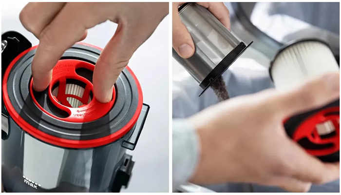 Циклонный фильтр — это усовершенствованный контейнер. Имеет форму обрезанного конуса — благодаря такому устройству воздух двигается циклически, заставляя мусор оседать внизу емкости за счет центробежной силы. Уже очищенный, воздушный поток выходит из пылесоса обратно. Обычно такая форма пылесборника соседствует с несколькими фильтрами, в том числе HEPA.
