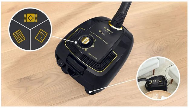Пылесос Bosch BGL38GOLD имеет стандартную конфигурацию — корпус на колесах, крепящийся к нему шланг с трубками-удлинителями и насадками. Данная модель рассчитана только на сухую уборку, которой достаточно для большинства пользователей. Мощный поток воздуха позволяет быстро всасывать как мелкие, так и крупные частицы, волосы и шерсть. Основной цвет прибора — черный. Пылесборник-мешок — привычный вариант, с которым легко работать, можно не беспокоиться о чрезмерном расходе электроэнергии. Он тщательно запирает внутри крупную пыль, но может незначительно пропускает очень мелкие частицы. Объем заполнения пылесборника — 4 л.