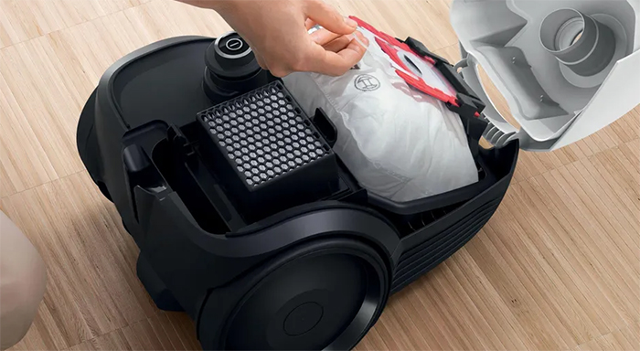 Пылесосы с мешком-пылесборником — недорогие напольные устройства с работой от электросети. В сменный мешок из плотного воздухопроницаемого материала с закрывающим клапаном, который находится внутри корпуса устройства, всасывается загрязненный воздух с пылью, шерстью животных и другим мусором.
