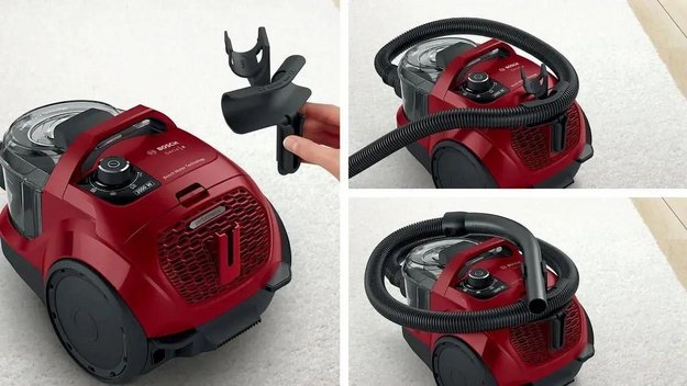 Пылесос Bosch BGS21WX200 имеет стандартную конфигурацию — корпус на колесах, крепящийся к нему шланг с трубками-удлинителями и насадками. Данная модель рассчитана только на сухую уборку, которой достаточно для большинства пользователей. Мощный поток воздуха позволяет быстро всасывать как мелкие, так и крупные частицы, волосы и шерсть. Основной цвет прибора — красный. В качестве пылесборника производитель установил стандартный контейнер. Пользоваться им легко и удобно: чтобы очистить, просто достаньте его и высыпьте все в мусорное ведро, а затем протрите или вымойте емкость изнутри. Объем заполнения пылесборника — 2 л.