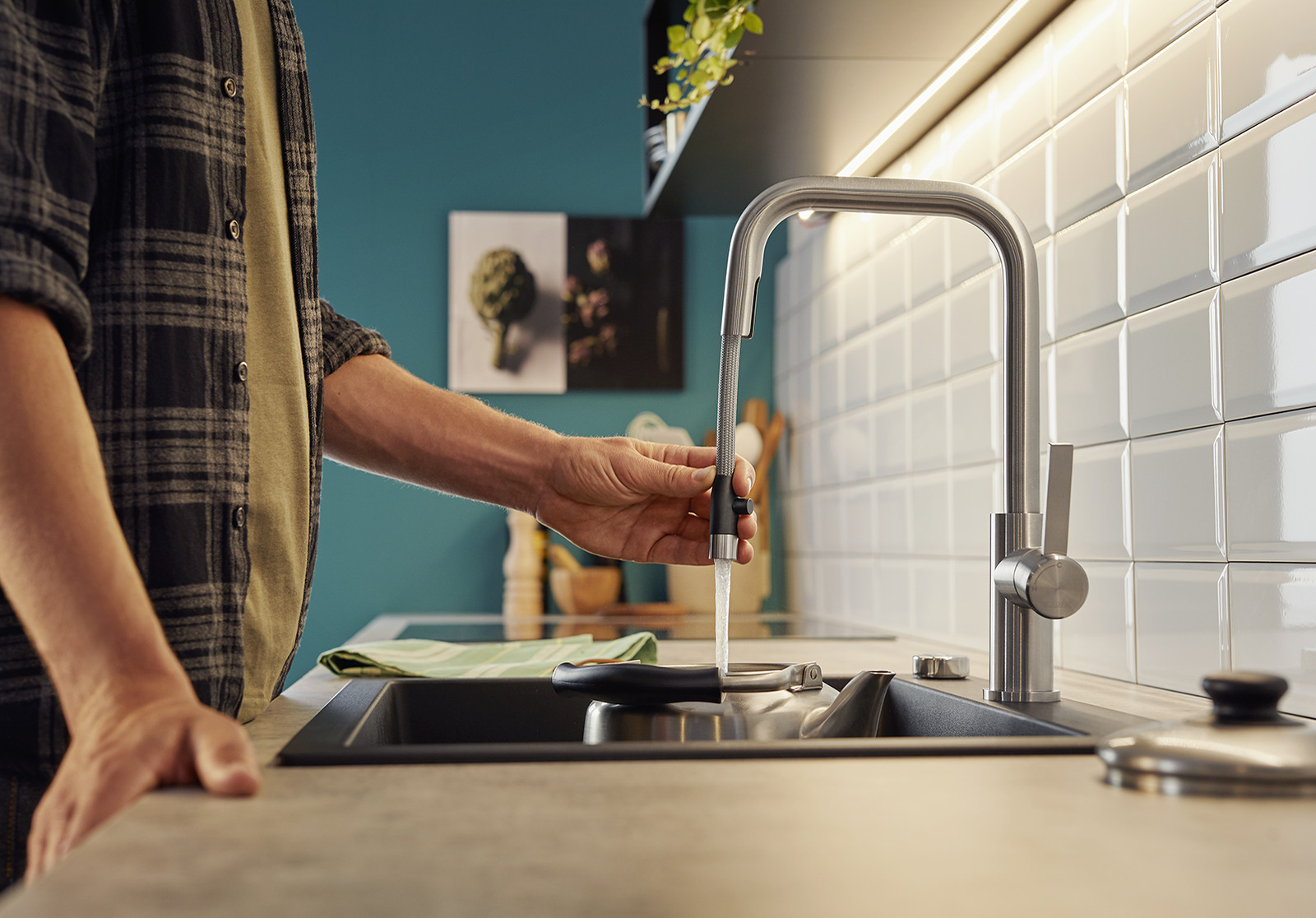 Специальная насадка позволяет выдвинуть излив как маленький шланг и направить струю в слишком высокую кастрюлю, которая не помещается под стационарным краном, на овощи в раковине, на загрязнения в неудобных уголках мойки, которые нужно удалить и т.д. Благодаря особой конструкции вы можете также направить воду из раковины в ванну или из одной чаши мойки в другую одним поворотом крана в нужную сторону.