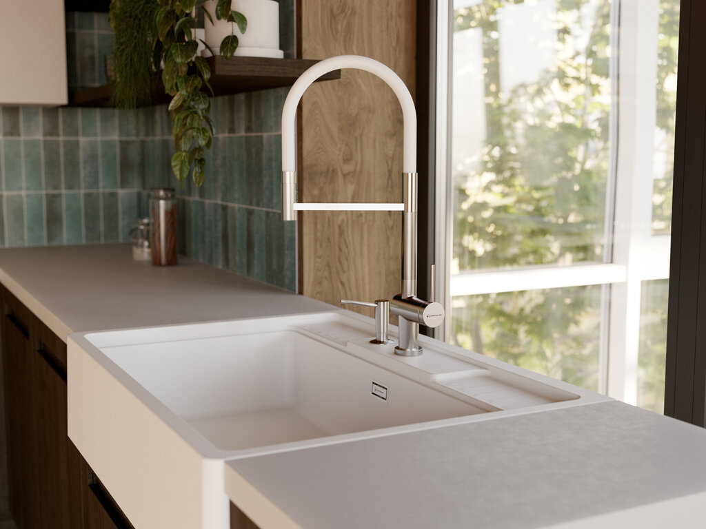 Выдвижной излив обеспечивает дополнительную свободу при мытье: шланг легко тянется и фиксируется в рабочем положении, а затем аккуратно возвращается на место. Аэратор равномерно насыщает струю воздухом, снижая расход воды и уменьшая брызги при использовании. Возможность подключения отдельного фильтра для питьевой воды делает устройство универсальным решением для кухни с требованием чистой воды для приготовления пищи и питья.