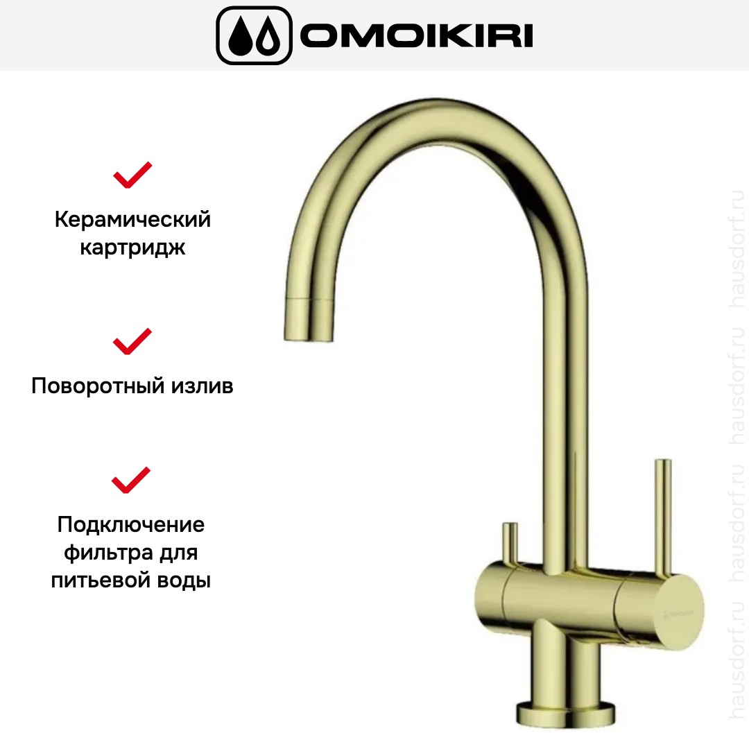 Смеситель OMOIKIRI Yamada LG выполнен в светлом золотом оттенке и сразу притягивает взгляд благодаря сдержанному, но благородному облику. Его габариты 22.1×14.5×37.2 см и аккуратные пропорции делают изделие гармоничным в любом кухонном интерьере. Высота излива 23.4 см и длина носика 20.4 см обеспечивают удобный зазор для мытья больших кастрюль и работы с высокими емкостями. Отделка привносит теплую ноту в цветовую гамму кухни и легко сочетается с деревянными или светлыми фасадами.