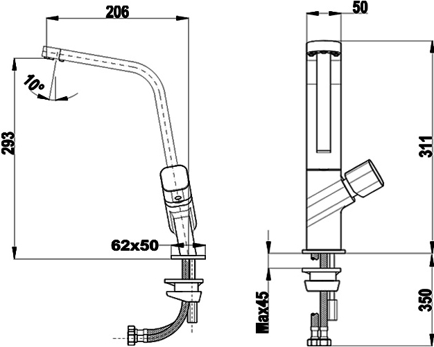 Практичная геометрия смесителя продумана для максимального удобства пользователя: высота излива 29,3 см обеспечивает достаточно пространства для мытья высоких кастрюль, а длина носика 20,6 см увеличивает зону доступа над мойкой. Поворотный излив упрощает работу с крупной посудой и позволяет направлять воду туда, где это нужно. Поставляемые в комплекте гибкие присоединительные шланги облегчают подсоединение к водопроводу и компенсируют неточности в отверстиях.
