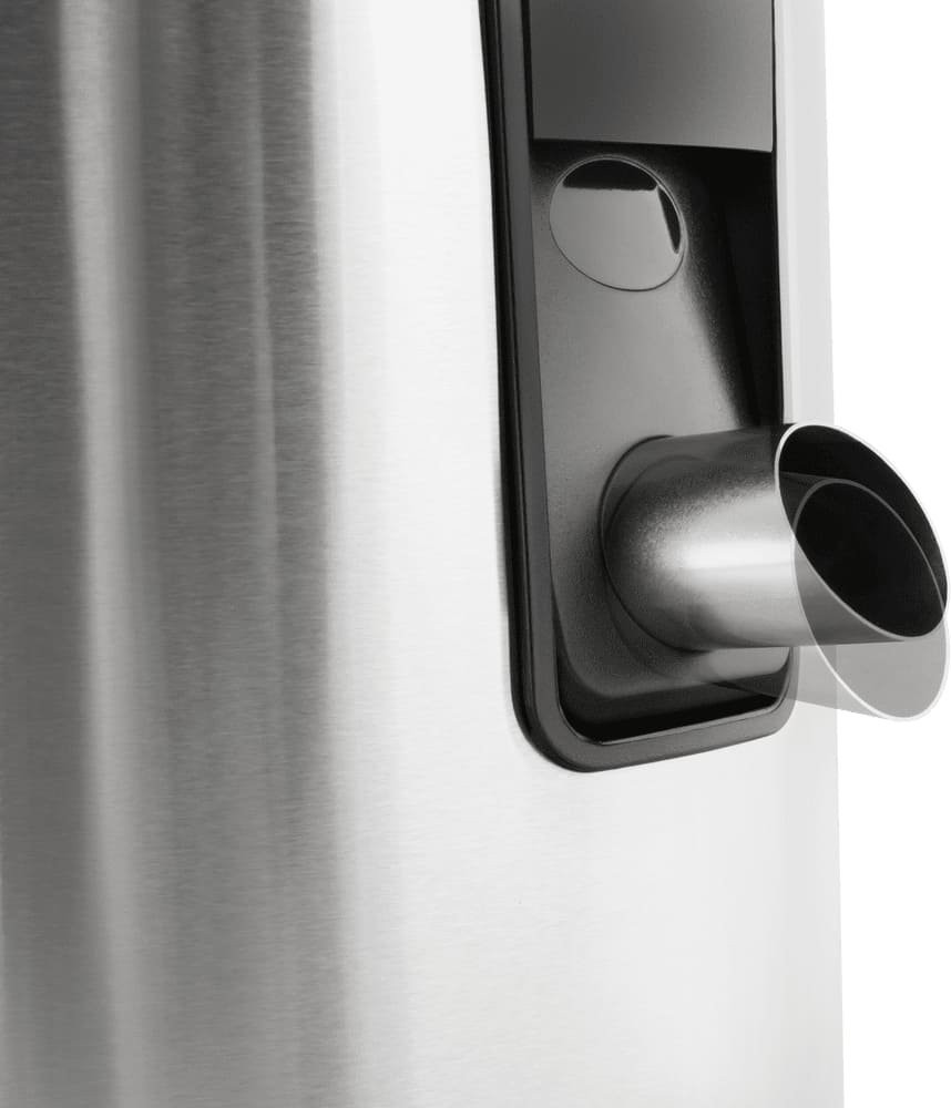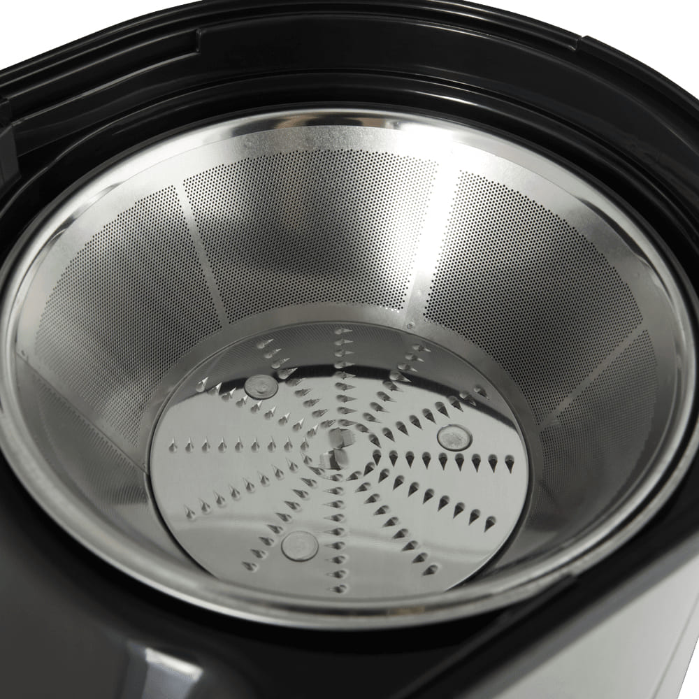 Корпус выполнен из прочной нержавеющей стали, что не только придаёт технике эстетичный, современный облик, но и гарантирует долговечность даже при интенсивном использовании. Сетка центрифуги также изготовлена из этого материала, устойчивого к коррозии и механическим повреждениям, что обеспечивает стабильную работу и лёгкость ухода. Резервуар для готового напитка сделан из безопасного пищевого пластика, прозрачного и удобного для контроля объёма.