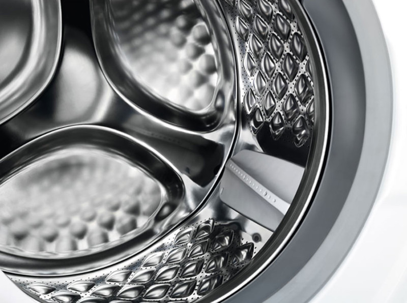 Барабан обычно изготавливается из тонкой нержавеющей стали, отверстия на боковой поверхности могут располагаться по-разному и иметь разную форму. Поверхность барабана в большинстве моделей не является гладкой: на ней находятся выпуклости и впадины для лучшего скольжения белья.
