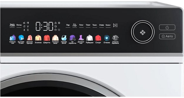 Электромеханическое управление удобно и понятно. Для выбора программ используются сенсорные кнопки, поворотный программатор. Количество режимов для стирки разных типов белья: 13.