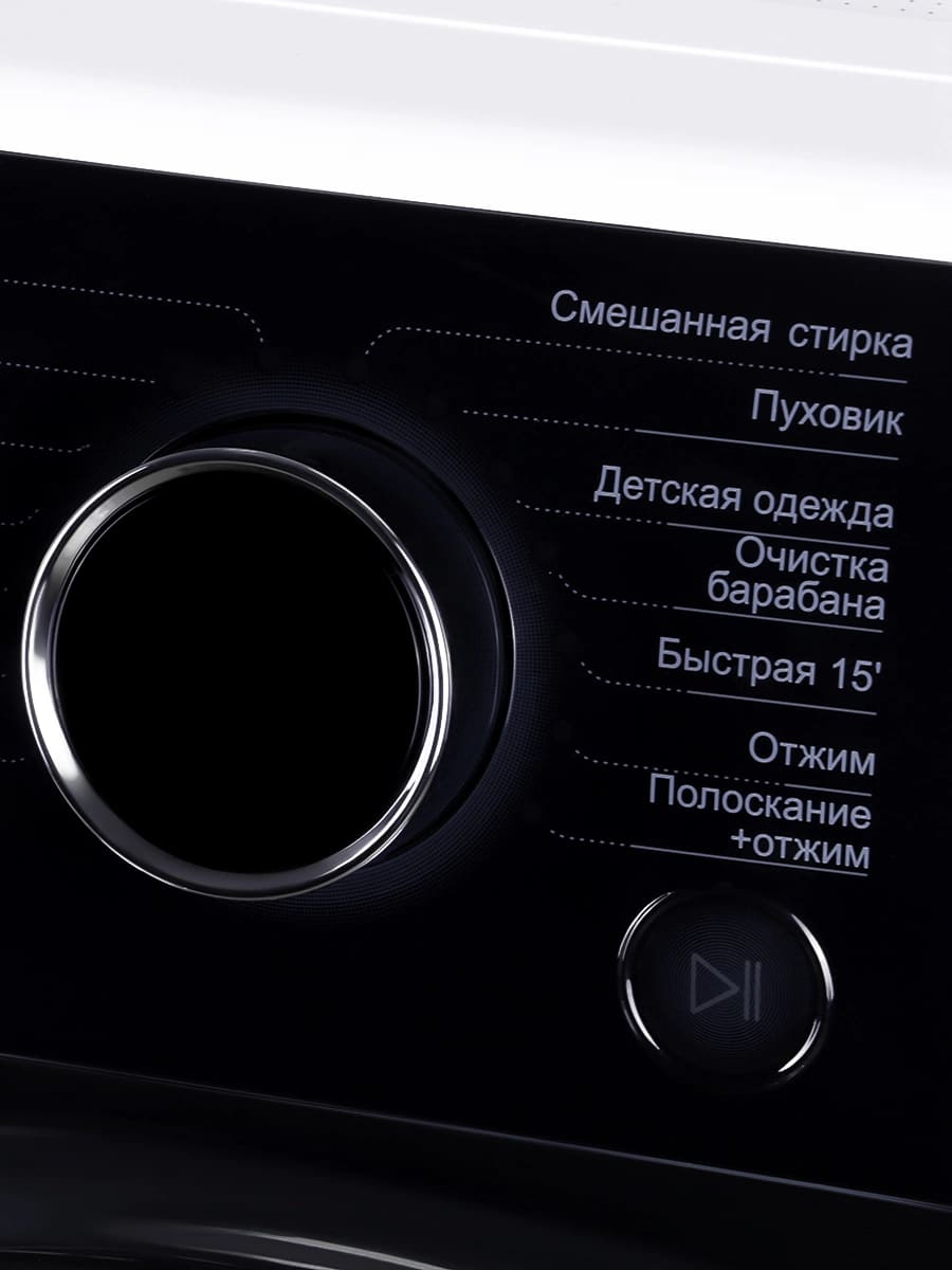 Электромеханическое управление удобно и понятно. Для выбора программ используются сенсорные кнопки, поворотный программатор. Количество режимов для стирки разных типов белья: 14.
