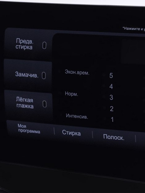 Достаточно простыми, но гораздо более информативными являются цифровые дисплеи, которые могут отображать числовую информацию и ограниченное количество символов. На таком дисплее, например, может отобразиться номер программы, скорость отжима, блокировка люка, отсрочка старта, температура воды, время, оставшееся до конца работы, символические обозначения действующих функций и прочая достаточно простая информация. Изображение может быть разного цвета — белого, зеленого или голубого, в любом оно будет хорошо заметно даже при отключенном освещении.