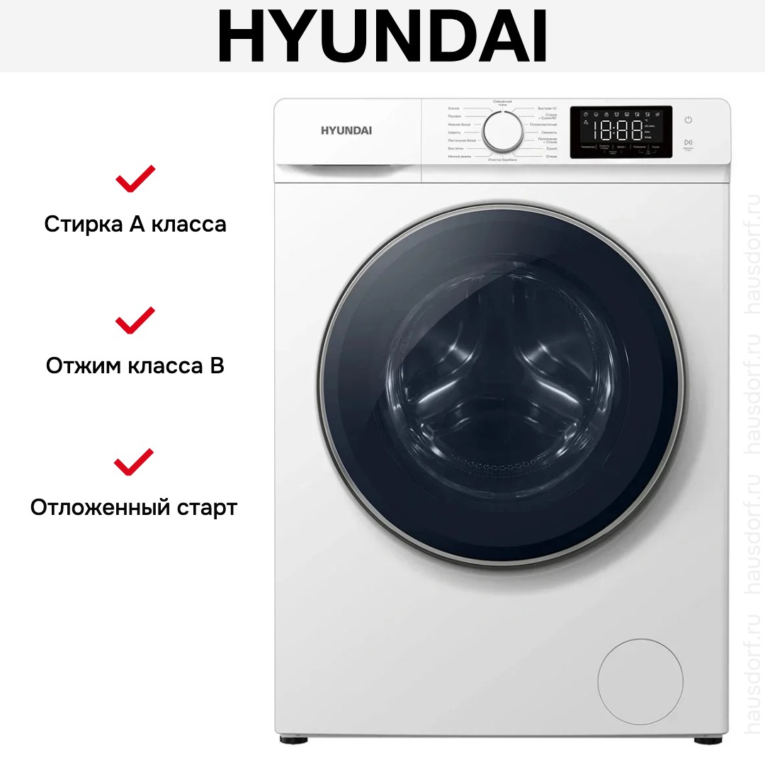 Для дома, Hyundai, Стирально-сушильная машина Hyundai WFD9212. Внешний вид сочетает лаконичную белую кузовную отделку с контрастным черным люком, что делает устройство универсальным для любого интерьера. Компактные габариты 85×60×61 см рассчитаны на стандартные ниши и не требуют дополнительного визуального пространства. Диаметр загрузочного окна 33 см и угол открывания 170° обеспечивают удобство загрузки даже объемных вещей без наклонов и перестановок.