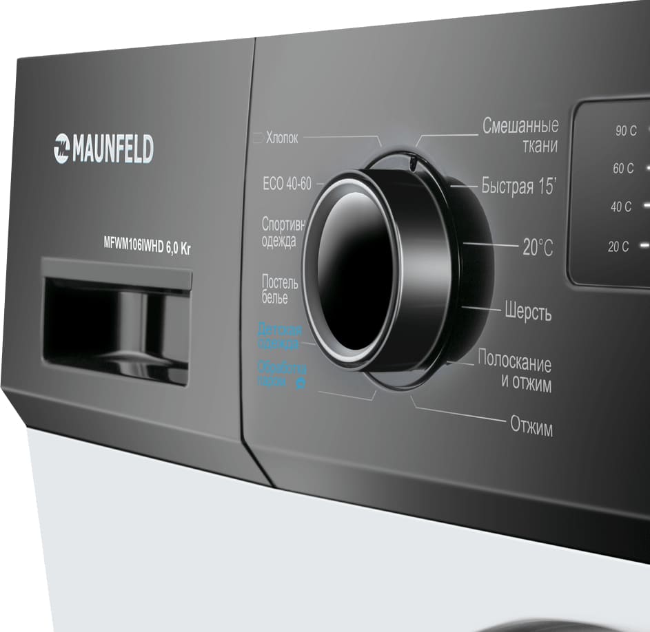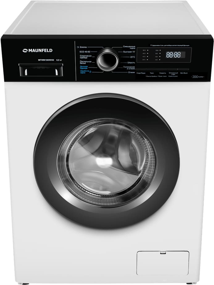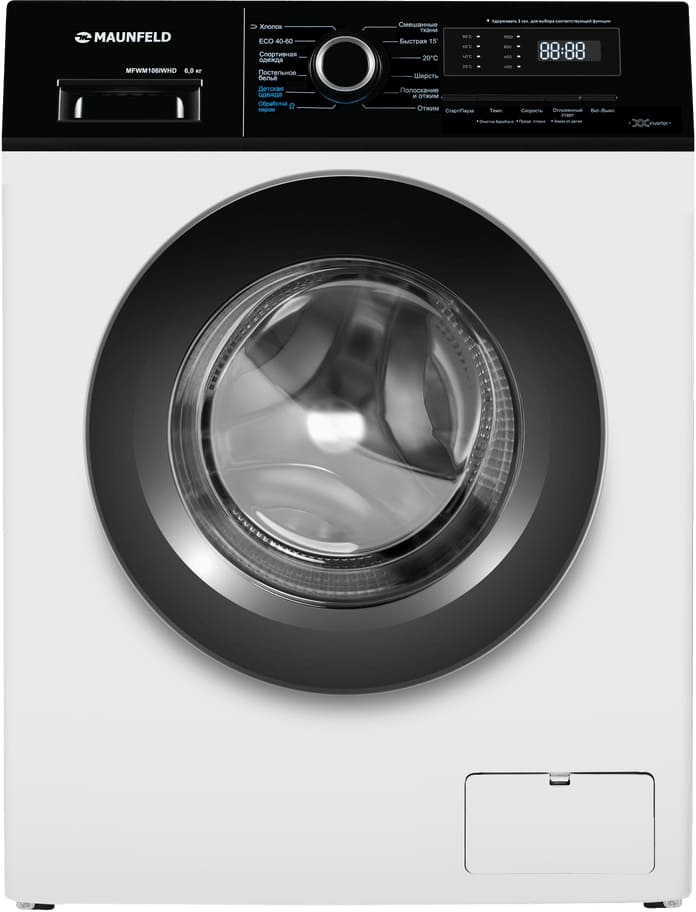 Стиральная машина Маунфилд MFWM106IWHD выпущена в стандартной конфигурации — устанавливается отдельно, поэтому рекомендуем заранее выделить для нее место в квартире. Благодаря классической фронтальной загрузке она привычна и удобна даже для тех, кто не очень разбирается в технике. За счет небольшой глубины данную модель предпочитают владельцы небольших квартир, студий. В барабан помещается не так много вещей за один раз, но тем, кто не любит копить вещи или просто мало стирает, будет достаточно. Максимальная загрузка: 6 кг.