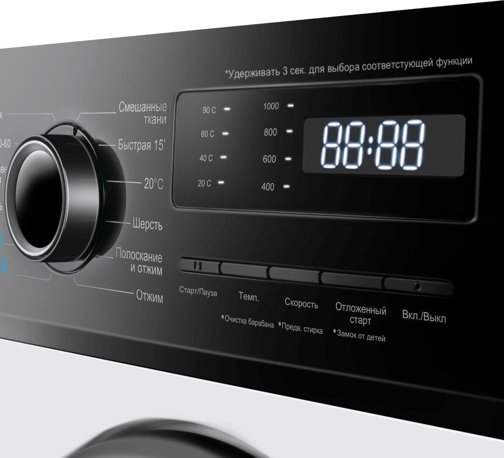 Вы можете отложить запуск, если хотите сэкономить на тарифах и включить машинку ночью, либо если планируете развесить белье сразу после возвращения работы и не ждать, пока закончится цикл. На панели управления отображаются разнообразные индикаторы, чтобы было проще следить за процессом, например: температуры стирки, скорости отжима, времени до окончания стирки, блокировки от детей, отсрочки старта. Скорость отжима достигает 1000 оборотов в минуту. Функцию отжима можно будет отключить вручную, если она вам не нужна.