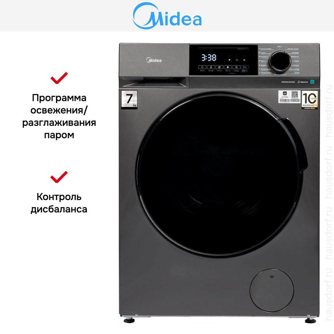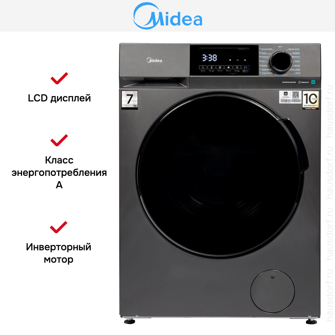 Стиральная машина Midea MFC3712BSW40-S выполнена в современном тёмном серебристом оттенке и рассчитана на удобство в домашнем использовании. Передняя панель аккуратно оформлена, сенсорные кнопки и поворотный программатор гармонично сочетаются с информативным дисплеем. Компактные габариты 85×59.5×40.5 см делают аппарат подходящим для небольших помещений и ниш, а высота 85 см позволяет комфортно загружать и выгружать бельё.