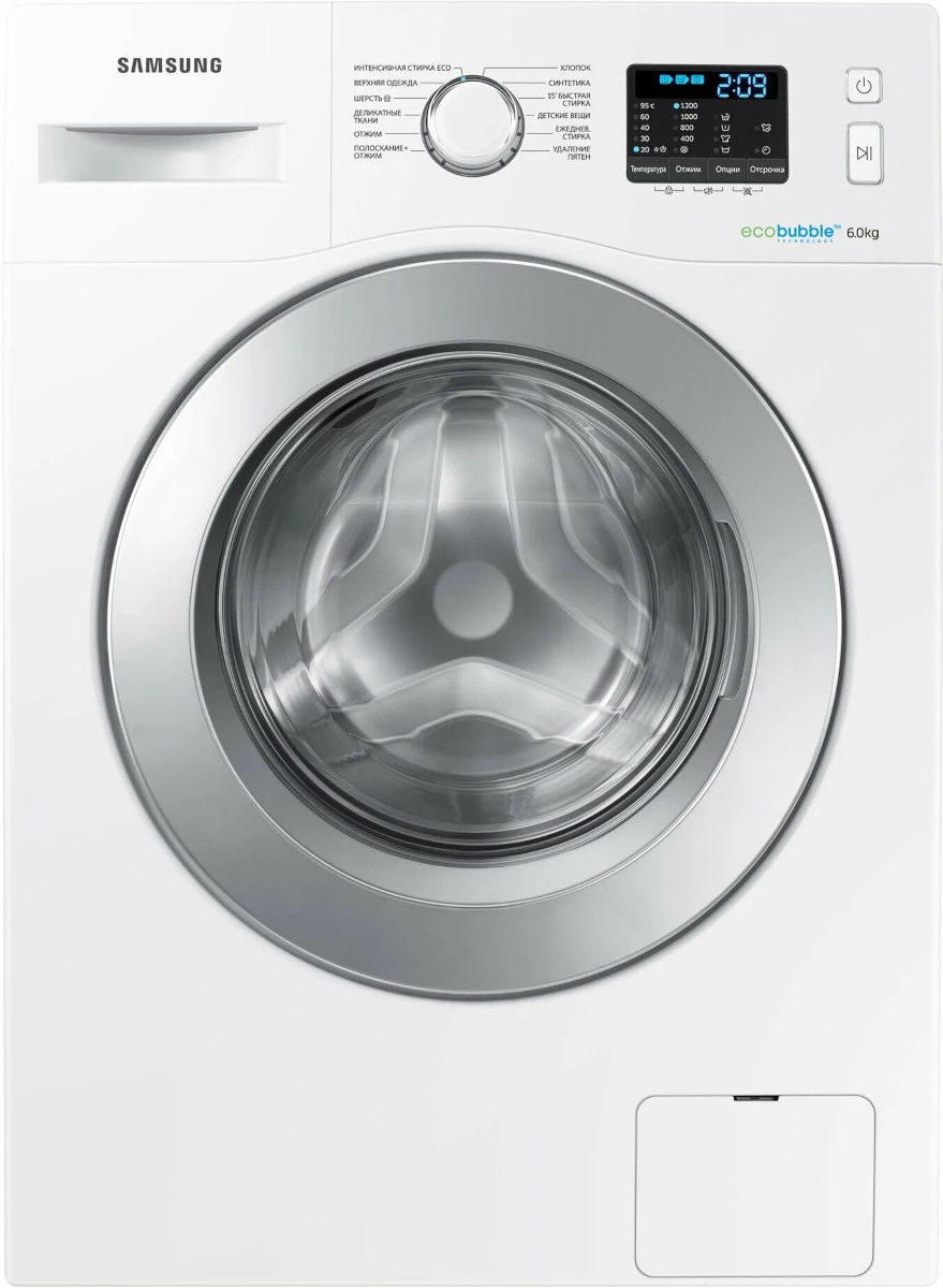 Стиральная машина Самсунг WW 60H2220EW выпущена в стандартной конфигурации — устанавливается отдельно, поэтому рекомендуем заранее выделить для нее место в квартире. Благодаря классической фронтальной загрузке она привычна и удобна даже для тех, кто не очень разбирается в технике. За счет небольшой глубины данную модель предпочитают владельцы небольших квартир, студий. В барабан помещается не так много вещей за один раз, но тем, кто не любит копить вещи или просто мало стирает, будет достаточно. Максимальная загрузка: 6 кг.