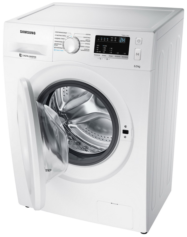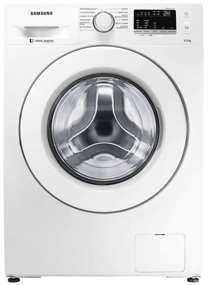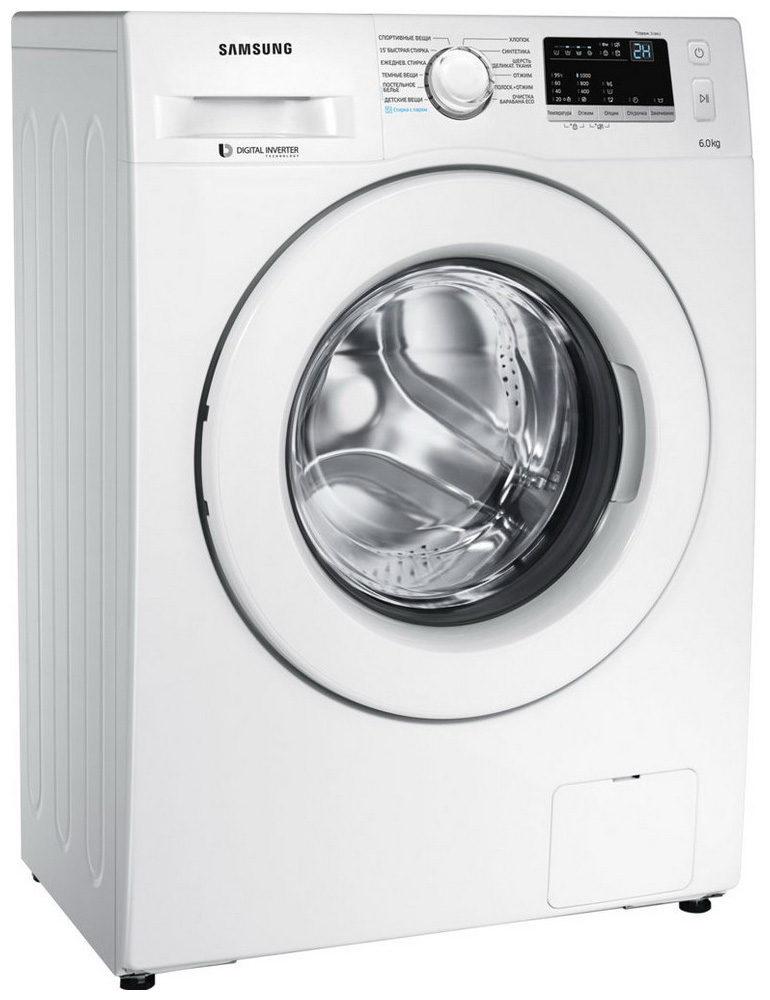 Стиральная машина Самсунг WW 60J30 G0LW выпущена в стандартной конфигурации — устанавливается отдельно, поэтому рекомендуем заранее выделить для нее место в квартире. Благодаря классической фронтальной загрузке она привычна и удобна даже для тех, кто не очень разбирается в технике. За счет небольшой глубины данную модель предпочитают владельцы небольших квартир, студий. В барабан помещается не так много вещей за один раз, но тем, кто не любит копить вещи или просто мало стирает, будет достаточно. Максимальная загрузка: 6 кг.