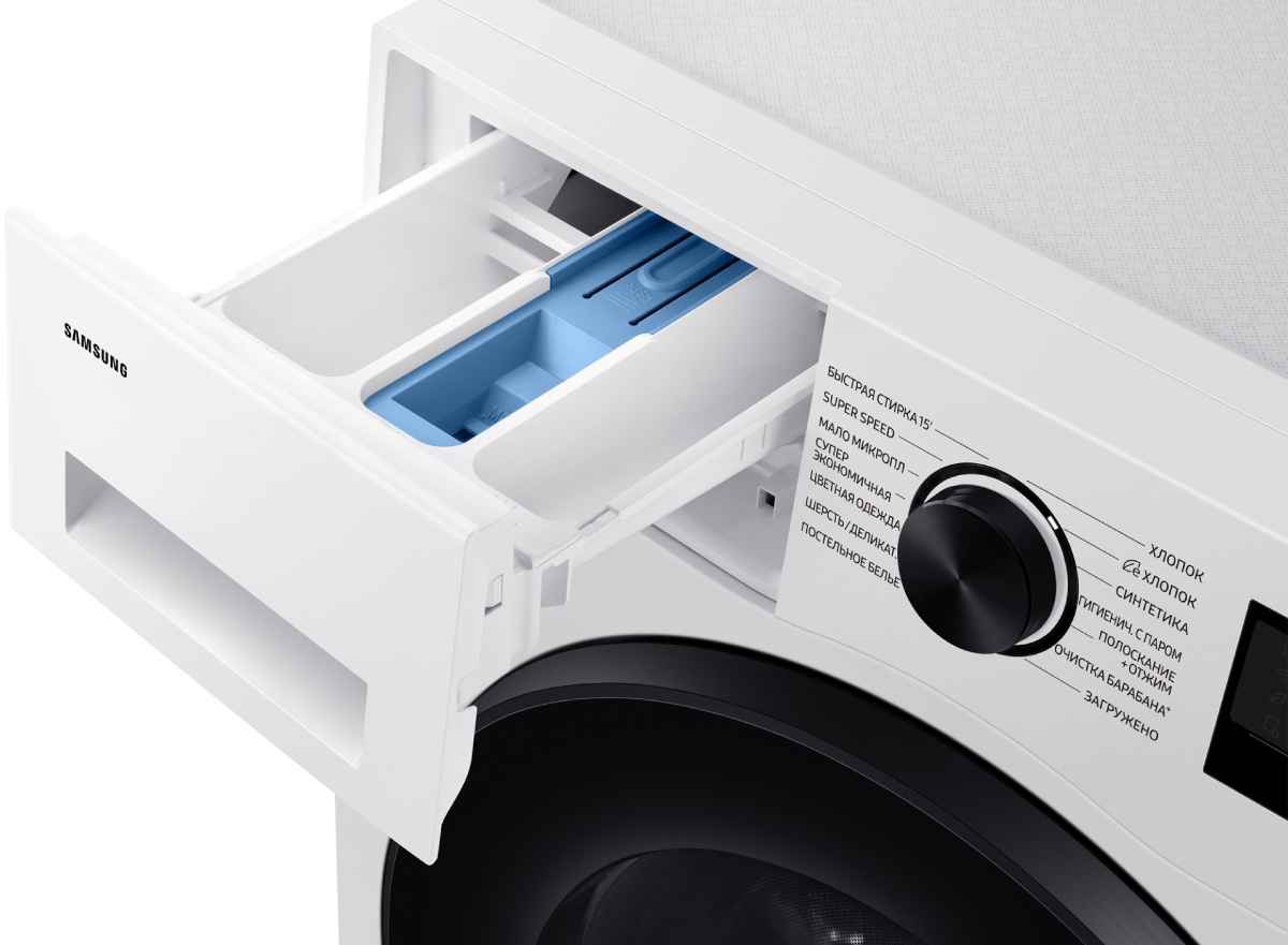 Цвет этой стиральной машинки — белый. В данной модели Samsung используется барабан Swirl. Мотор: Инверторный. Благодаря ему машина работает тише, потребляет меньше электроэнергии, сохраняя при этом необходимую мощность.