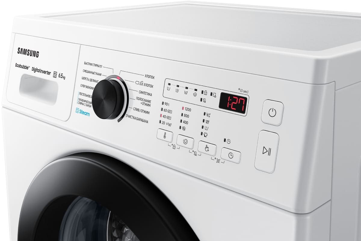 Цвет этой стиральной машинки — белый. В данной модели Samsung используется барабан Diamond. Мотор: Инверторный. Благодаря ему машина работает тише, потребляет меньше электроэнергии, сохраняя при этом необходимую мощность.