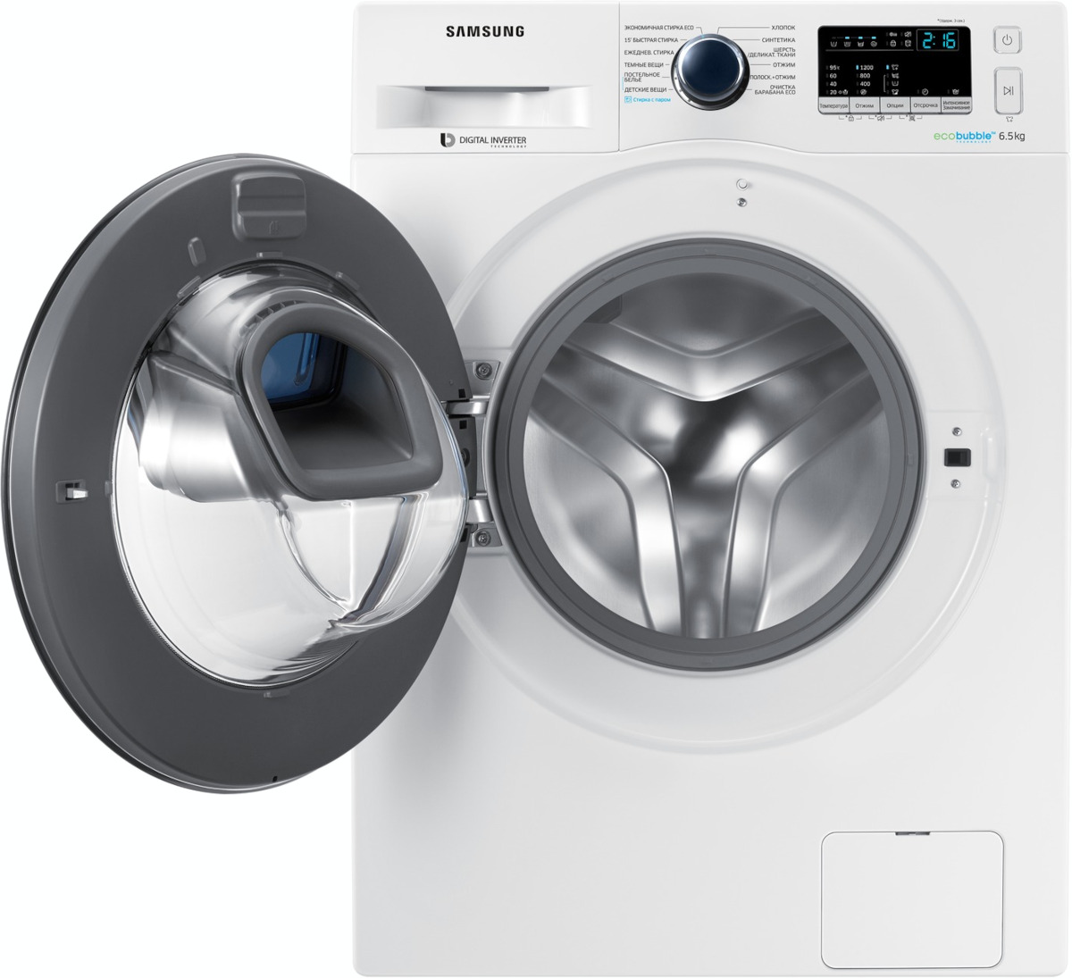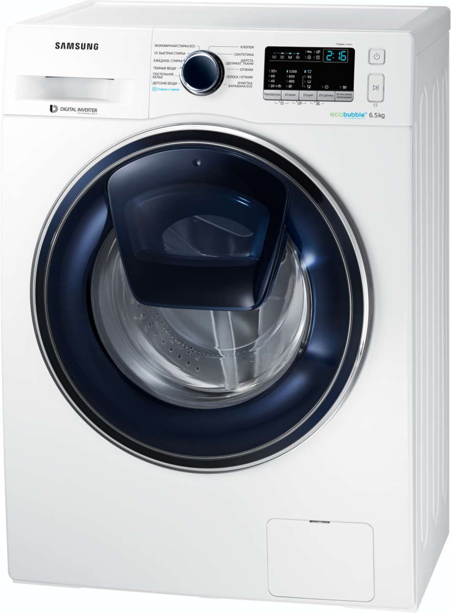 Цвет этой стиральной машинки — белый. В данной модели Samsung используется барабан Diamond. Мотор: Инверторный. Благодаря ему машина работает тише, потребляет меньше электроэнергии, сохраняя при этом необходимую мощность.