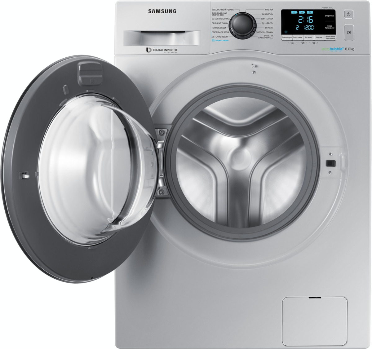 Цвет этой стиральной машинки — серебристый. Мотор: Инверторный. Благодаря ему машина работает тише, потребляет меньше электроэнергии, сохраняя при этом необходимую мощность.