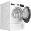 На LED-дисплее отображается информация о состоянии работы, включая индикацию заполнения емкости для конденсата и необходимости опорожнения резервуара или смены ворсового фильтра. Модель оснащена стандартным типом двигателя и емкостью для сбора конденсата. В дополнение к базовым функциям машина предлагает ряд дополнительных параметров, включая Smart Dry для автоматического выбора программы сушки, AutoClean для автоматической очистки от ворса, функцию Home Connect (Wi-Fi) для управления через смартфон, бесступенчатый выбор времени отложенного старта и регулируемую температуру сушки.