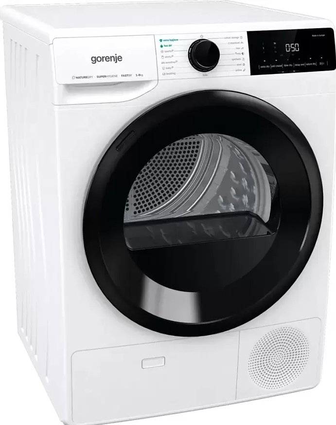 Сушильная машина Gorenje DNA82 представлена в компактном и строгом корпусе для бытового использования. Лаконичный белый цвет сочетает практичность и универсальность в интерьере. Передняя панель и дверца выполнены в контрастном черном оттенке для аккуратного визуального акцента. Круглая стеклянная дверца диаметром 350 мм обеспечивает широкий обзор внутреннего пространства и удобство загрузки. Угол открытия 180° облегчает укладку больших вещей и доступ к барабану при разгрузке.