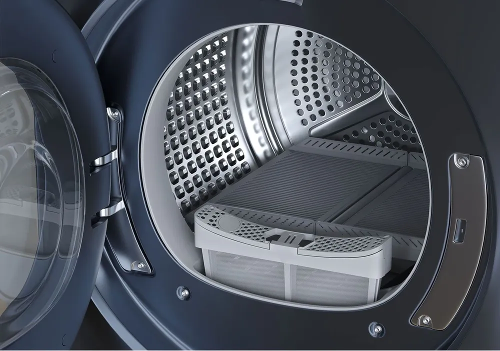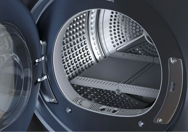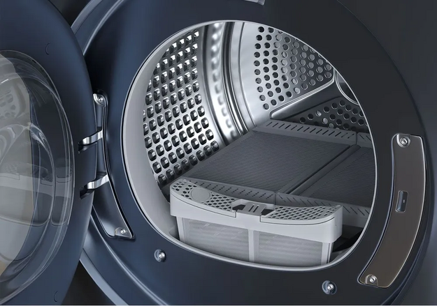 Тип сушки белья в данной модели — конденсационная с тепловым насосом. Это самый распространенный вариант, так как его просто реализовать и в работе он надежен, безопасен и удобен.