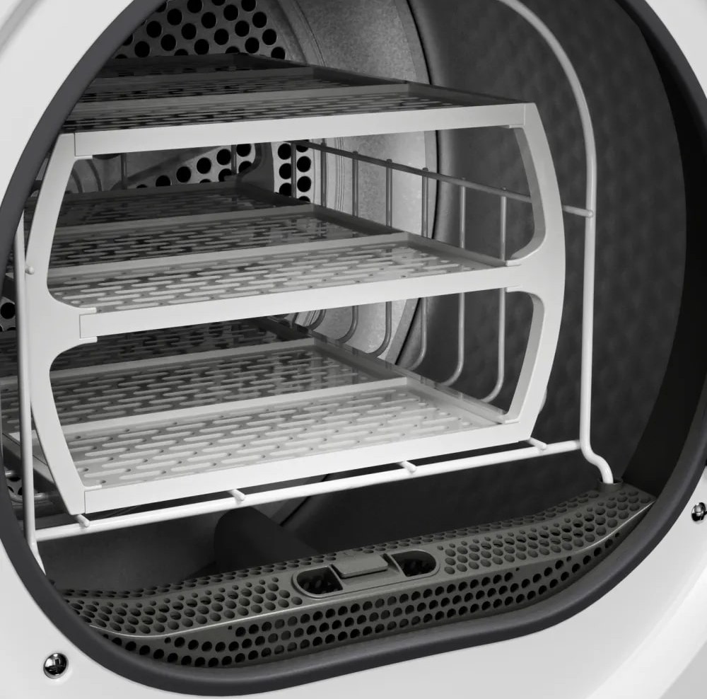 Тип сушки белья в данной модели — тепловой насос. Благодаря этому воздух поступает в барабан уже теплым, что ускоряет работу.