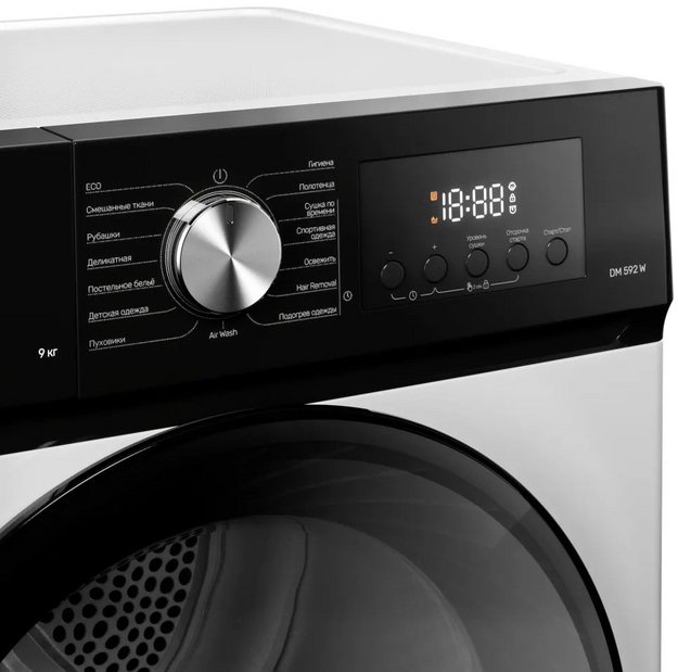 Элементы на панели управления сушильной машины служат для выбора программы сушки, для регулировки параметров работы, для задания дополнительных опций. Большинство сушильных маши оборудовано поворотными переключателями: с их помощью можно легко выбирать программу сушки — по остаточной влажности, по типу ткани, по виду изделий, по времени. Кнопки предназначаются для добавления к программе дополнительных опций: они могут быть как обычными, так сенсорными — в последнем случае все варианты выбора отображаются на дисплее, и возможности управления становятся более удобными и гибкими.