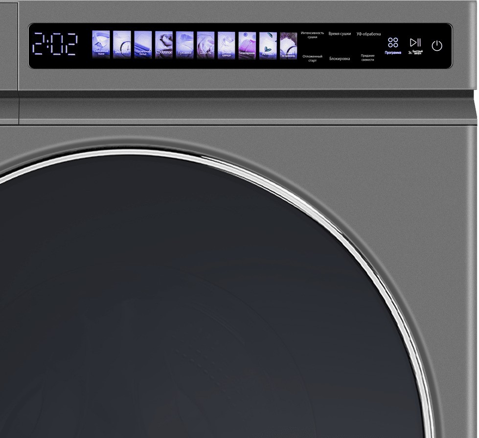 Элементы на панели управления сушильной машины служат для выбора программы сушки, для регулировки параметров работы, для задания дополнительных опций. Большинство сушильных маши оборудовано поворотными переключателями: с их помощью можно легко выбирать программу сушки — по остаточной влажности, по типу ткани, по виду изделий, по времени. Кнопки предназначаются для добавления к программе дополнительных опций: они могут быть как обычными, так сенсорными — в последнем случае все варианты выбора отображаются на дисплее, и возможности управления становятся более удобными и гибкими.