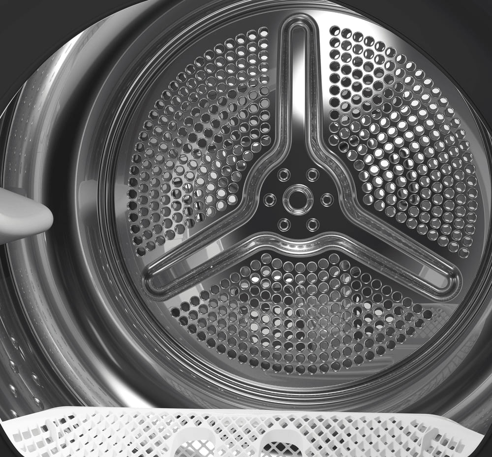 - Тепловой насос — поступающий внутрь воздух нагревается, что ускоряет и улучшает эффективность сушки. Затем он проходит через конденсационный отдел, отдает влагу и сухим повторно возвращается в барабан.