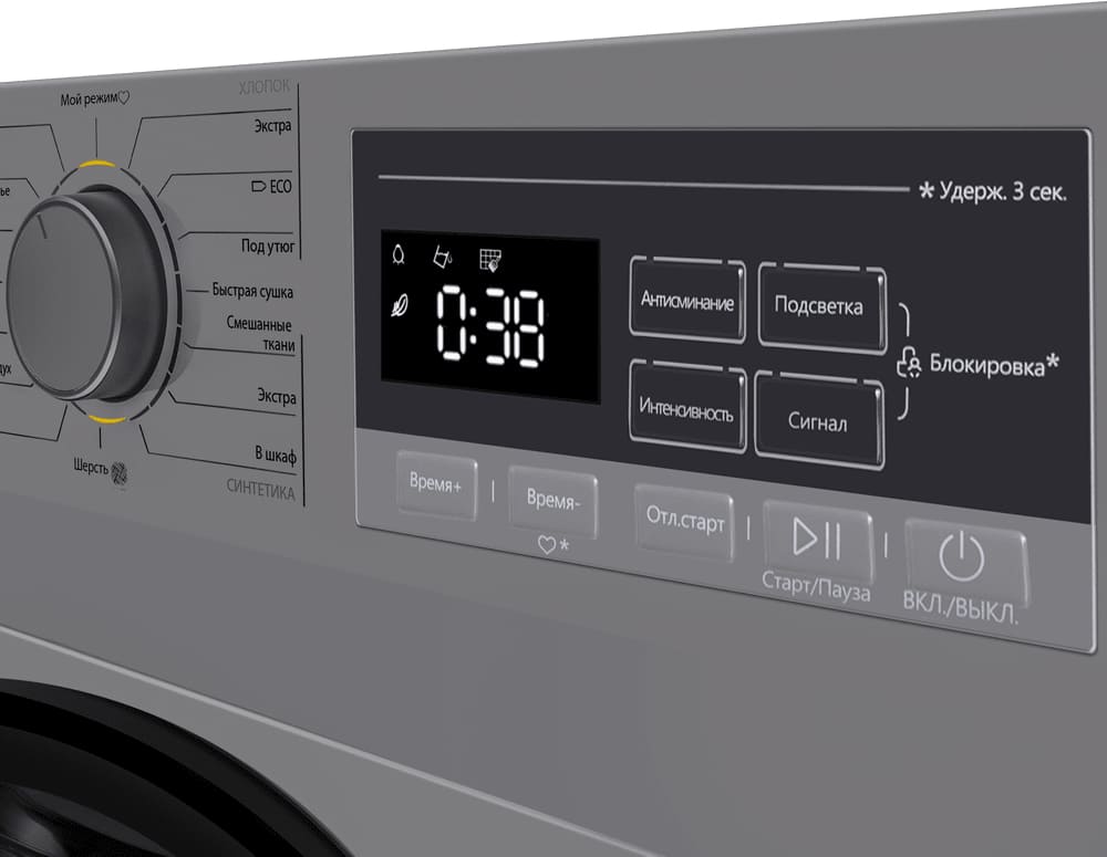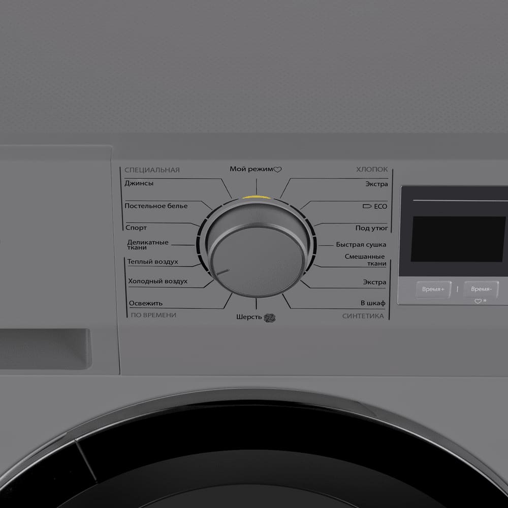 Вы можете самостоятельно выбрать время, которое будет длиться программа, но нужно тщательно рассчитать его — обычно проще воспользоваться предложенными вариантами. Возможность сохранить индивидуальные настройки облегчает и ускоряет запуск последующих циклов. Используйте также параметры остаточной влажности, в данной модели есть следующие: под утюг, в шкаф, экстрасушка — они позволяют точно определить, каким вы достанете белье из барабана.