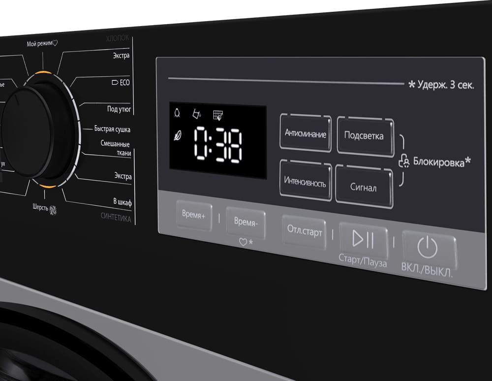 Электронное управление удобно и понятно для людей разного поколения. Контролировать процесс можно с помощью дисплея, на который выводится основная информация. В вашем распоряжении индикаторы: времени до окончания программы, заполнения емкости для конденсата/необходимости опорожнения резервуара, заполнения ворсового фильтра/необходимости смены фильтра, активной функции защиты от детей/блокировки панели управления, нарушений в работе. Вы можете использовать таймер, чтобы отложить запуск на подходящее время. Когда машинка прекратит работу, вы услышите специальный сигнал. Другие полезные опции, которые помогут вам: сенсор влажности.