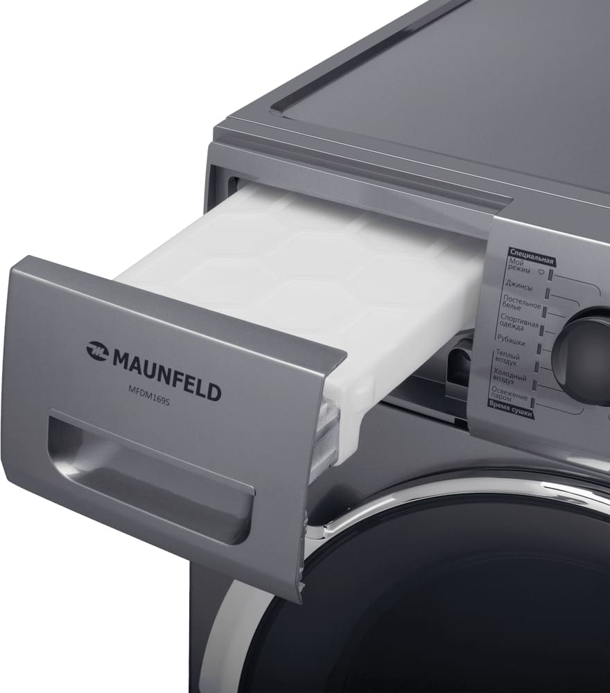 Сушильная машина Maunfeld предназначена для домашнего использования, поэтому имеет стандартные габариты и большое разнообразие программ. Так как она устанавливается отдельно, нужно заранее найти достаточно места в помещении. Особенности, на которые нужно обратить внимание при размещении: возможность установки в колонну. Колонна — это название для совместной установки со стиральной машиной друг на друга, обычно для этого нужен специальный крепежный элемент.