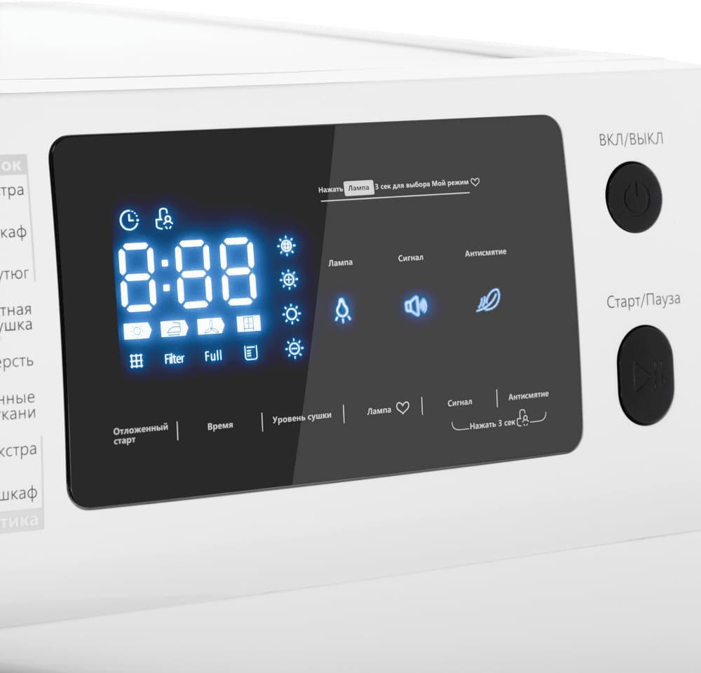 Функция необходима, если вам удобно запускать сушку к вашему приходу с работы или оставлять на ночь. Обычно максимальное время отсрочки — 24 часа.