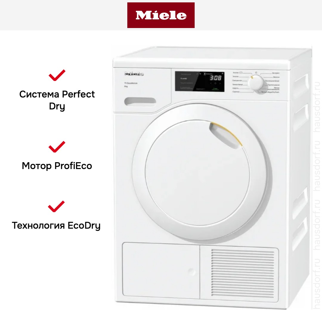 Запатентованная гарантирует согласованную работу и автоматическую очистку теплообменника и фильтра, так что пользователю не нужно беспокоиться и следить за степенью засорения теплообменника ворсом, а затем извлекать и прочищать его вручную, что также занимает значительное время. Таким образом удается поддерживать короткие рабочие циклы для сушки белья из ткани любого вида, а значит, и экономить электроэнергию: срок службы машины при этом не имеет значения. Все сушильные машины Miele, оснащенные технологией EcoDry, относятся к наивысшему классу энергоэффективности А+++.