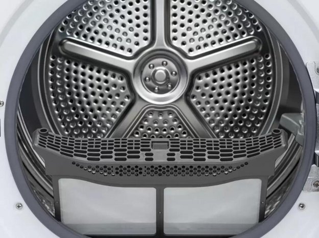 - Тепловой насос — поступающий внутрь воздух нагревается, что ускоряет и улучшает эффективность сушки. Затем он проходит через конденсационный отдел, отдает влагу и сухим повторно возвращается в барабан.