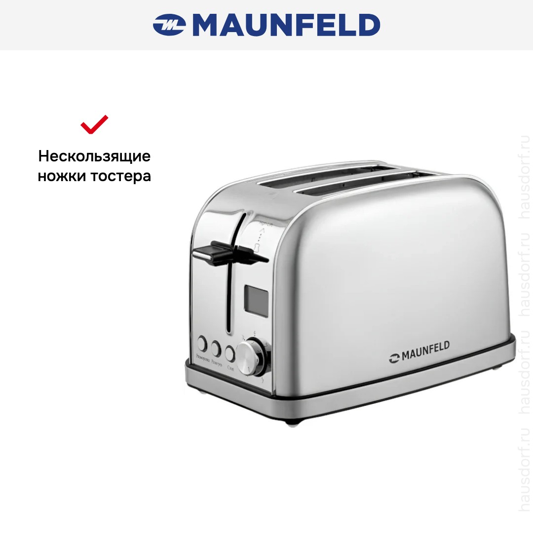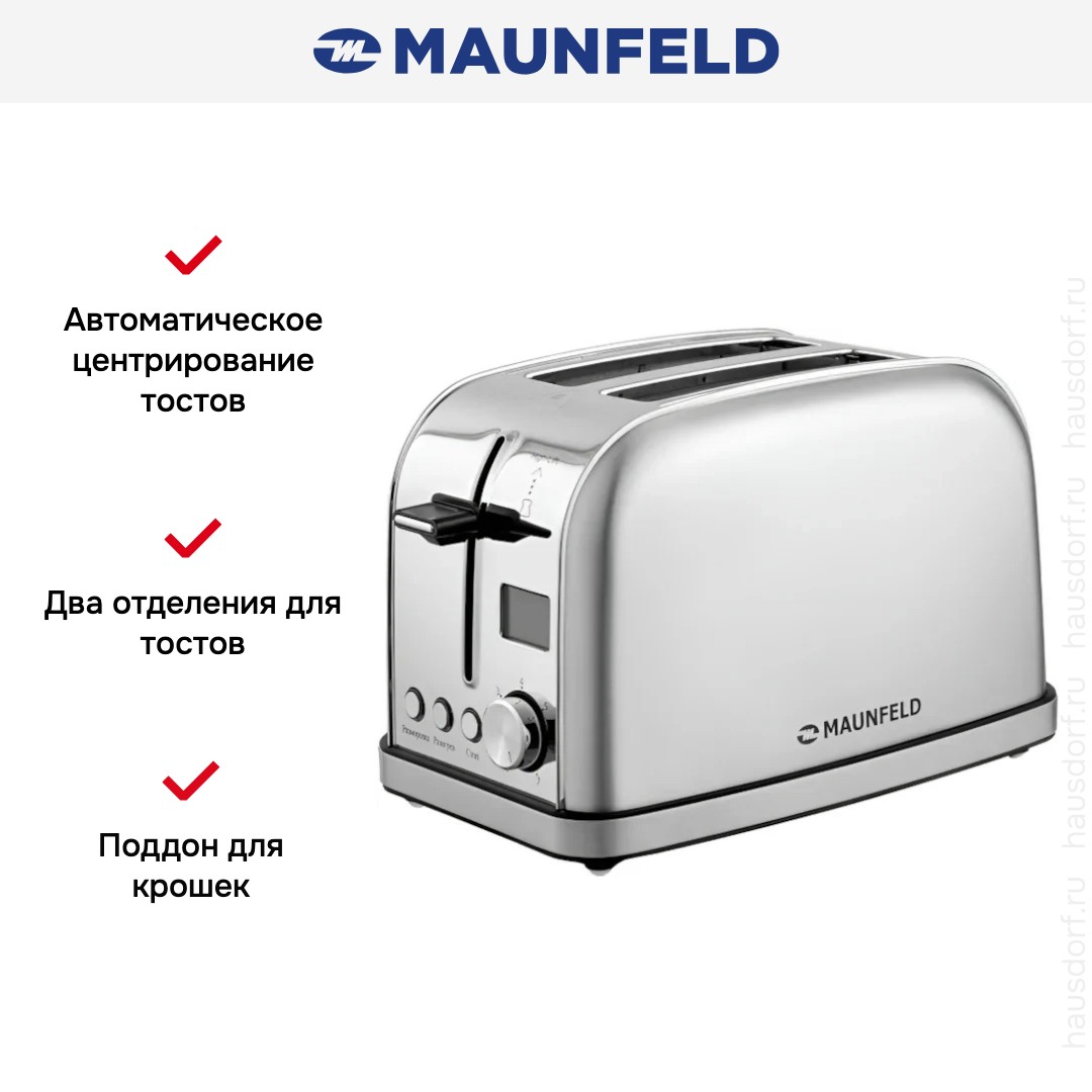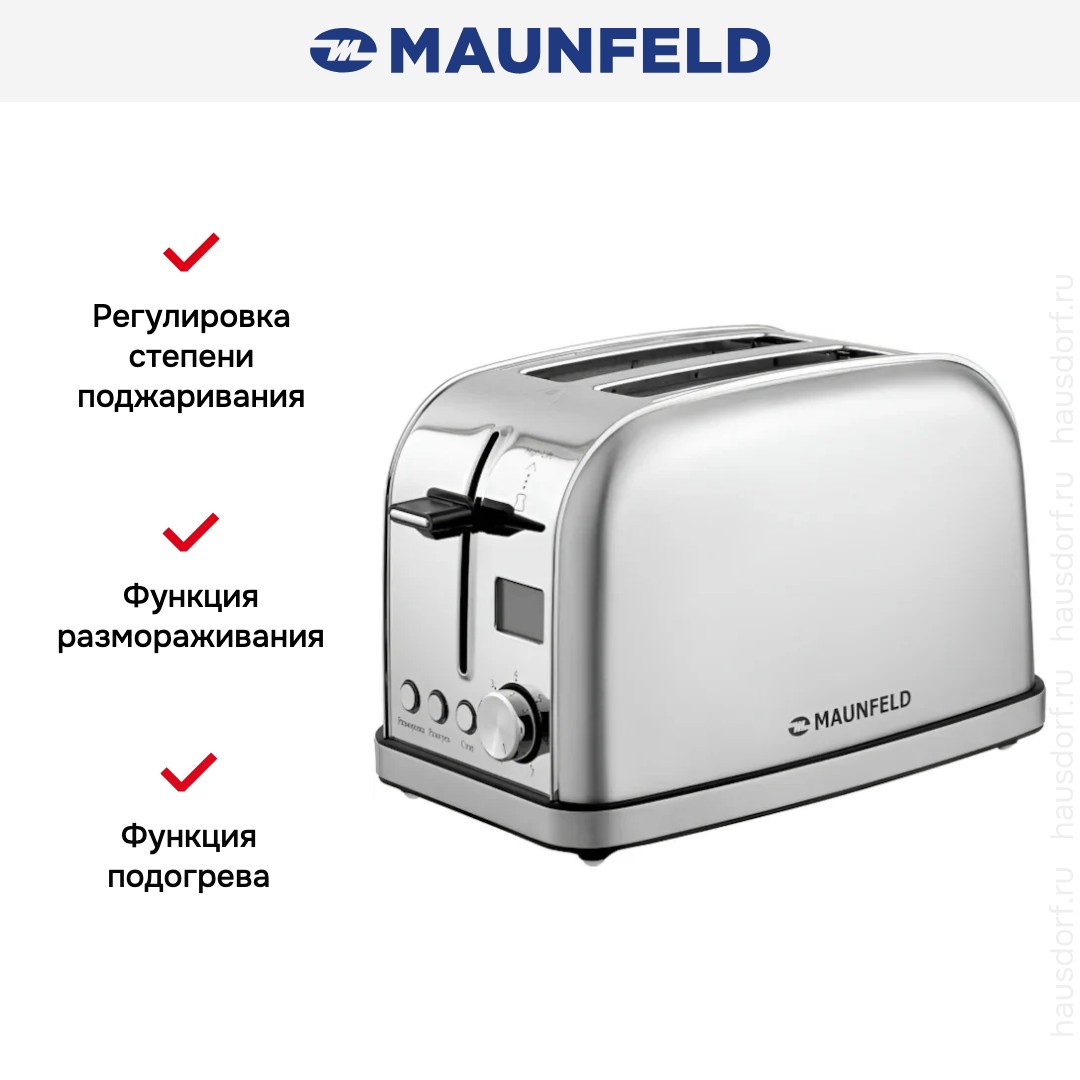 Стильный тостер Maunfeld имеет компактный корпус на устойчивых ножках, благодаря которым не пошатывается, даже если хлеб выпрыгивает вверх в конце приготовления. Основной материал, из которого изготовлен прибор, — нержавеющая сталь. Его главный оттенок — нержавеющая сталь. Простое и понятное механическое управление позволяет быстро разобраться во всех функциях. Простое и понятное электронное управление позволяет быстро разобраться во всех функциях. На корпусе расположены кнопочные+поворотные переключатели для изменения настроек. Благодаря небольшому дисплею еще удобнее следить за процессом.