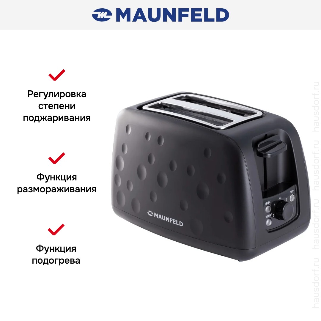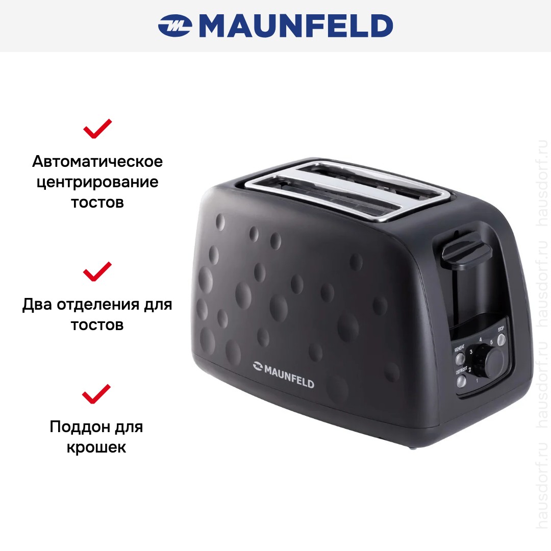 Стильный тостер Maunfeld имеет компактный корпус на устойчивых ножках, благодаря которым не пошатывается, даже если хлеб выпрыгивает вверх в конце приготовления. Основной материал, из которого изготовлен прибор, — пластик/ сталь. Его главный оттенок — черный. Простое и понятное механическое управление позволяет быстро разобраться во всех функциях. Простое и понятное электронное управление позволяет быстро разобраться во всех функциях. На корпусе расположены кнопочные+поворотные переключатели для изменения настроек.