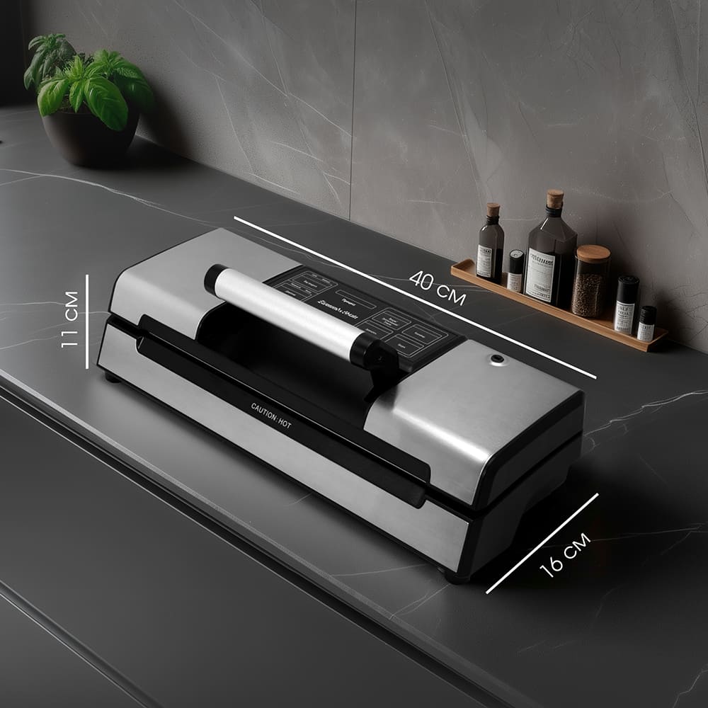 Габаритные размеры вакуумных упаковщиков, или вакууматоров, зависят прежде всего от типа их установки. Встраиваемые модели для домашнего использования обычно устанавливаются в колонну вместе с другой бытовой техникой. Зачастую они размещаются под устройствами высотой около 45 см — например, микроволновыми печами, духовками или пароварками. В этом случае высота составляет около 15 см: суммарная высоте двух устройств равна 60 см, что соответствует высоте стандартной ниши. Вакууматоры-соло могут иметь высоту от 10 см (бескамерные модели) до 1 м (камерные профессиональные модели).