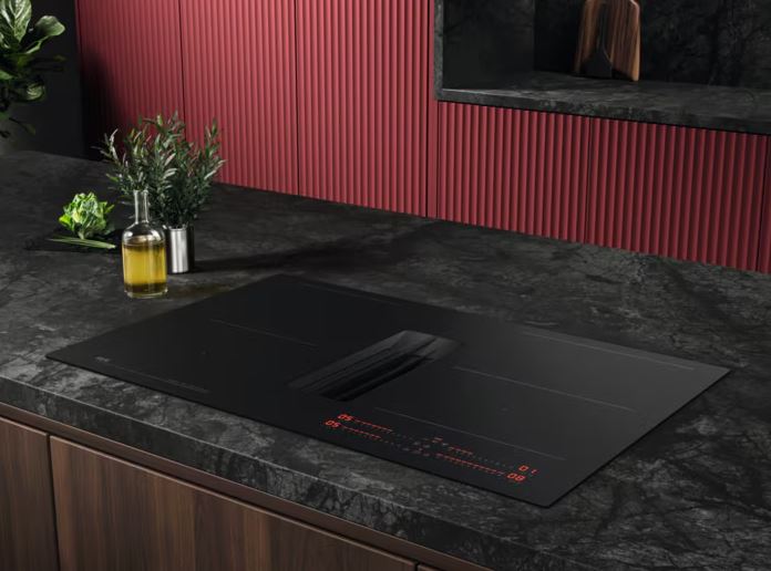 Вытяжка, встроенная в варочную панель — достаточно удобный вариант, позволяющий сэкономить место в кухне. Такая конструкция позволяет лучше улавливать испарения, не давая им распространяться по всему помещению, и способствует более качественной очистке воздуха. Большинство подобных моделей может работать только в режиме рециркуляции воздуха, с удалением капель жира, сажи, неприятных запахов при помощи системы фильтров. Работу в режиме отвода загрязненного воздуха через систему вентиляции организовать довольно сложно, поскольку вытяжка располагается низко над полом. Часто варочная панель находится на кухонном острове, что также мешает присоединению к вентиляции. Еще одна особенность подобных моделей состоит в том, что под варочной панелью нельзя разместить духовку или другую технику, так как место будет занято.