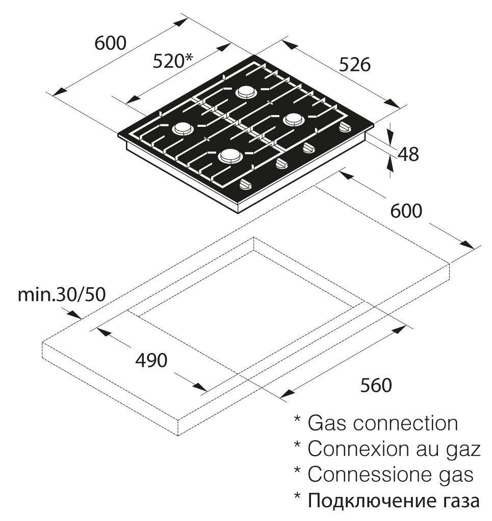 Отверстие в нише выполняют, исходя из размеров самой варочной панели — они должны соответствовать друг другу либо немного превышать размеры выреза. При выборе наиболее распространенной варочной панели с 4 конфорками в столешнице вырезается отверстие шириной 59 см и глубиной около 49-50 см. Толщина столешницы должна быть немного меньше, чем высота варочной панели, в противном случае панель придется заглубить, чтобы она не слишком выступала.