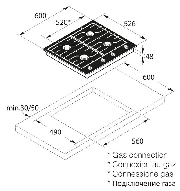 По умолчанию газовая панель рассчитана на присоединение к газовой магистрали, однако ее можно с успехом использовать, даже если дом не газифицирован, в том числе подключать самостоятельно. Для этого используется газ LPG G30 в баллонах, где он находится под высоким давлением 50 мбар, в то время как по трубе газопровода подается газ NG G20 под давлением 20 мбар.